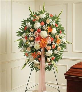 Funeral_White Sympathy Standing SprayThis Sympathy Standing Spray, in shades of peach, orange and white, is a beautiful symbol of your sympathy and support. • Peach roses, orange Asiatic lilies, white carnations and more |